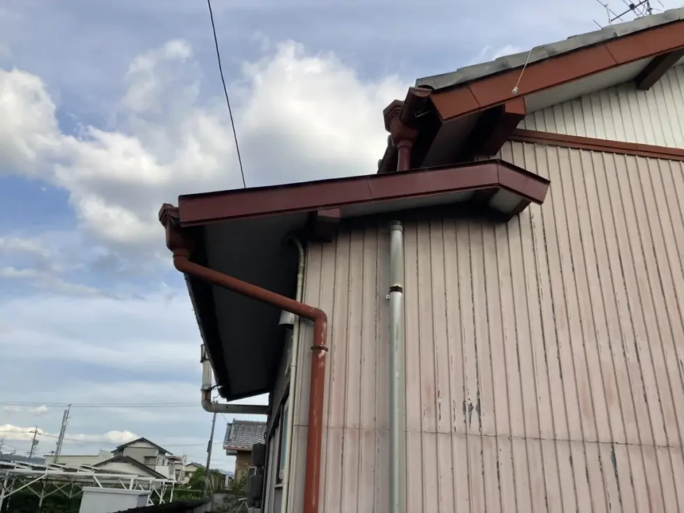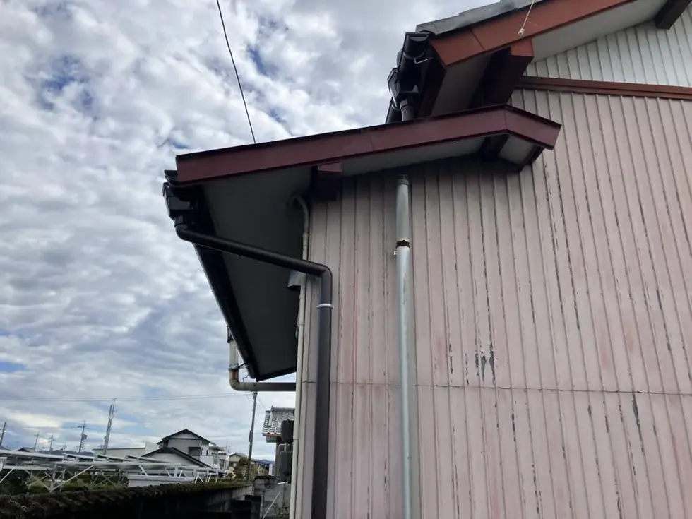 浜松市浜名区尾野のI様邸にて、一部雨どい取り替え工事および軒先面土工事が完了しました。
